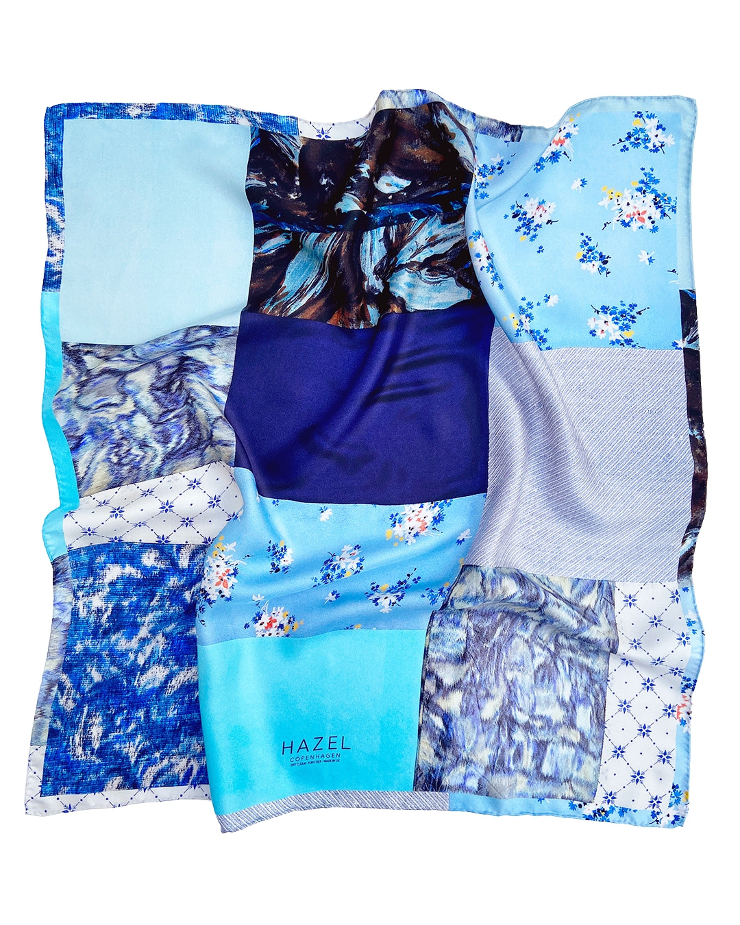Silketørklædet der gør dig Beautiful in Blue, er super anvendeligt og smukt i dejlige blå farver med de smalle fine kanter. Det er et særligt artwork, nemlig et patchwork som Susanne Schjerning har syet af flotte blå kjolestoffer fra 60èrne, små stofstykker som Susanne har gemt i sit arkiv, kommer nu til verden igen i et moderne patchwork to wear.