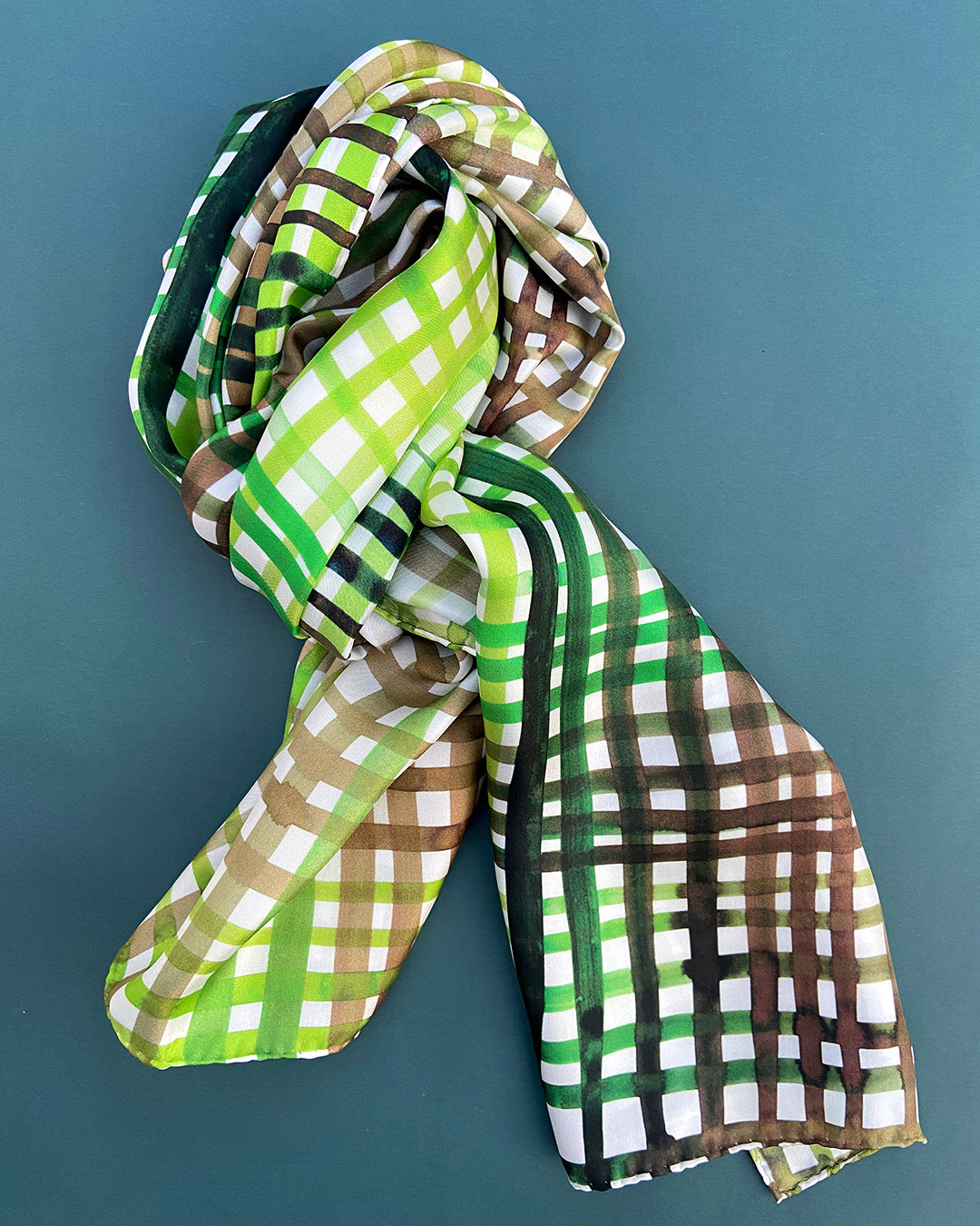 Forkæl dig selv med silketørklædet Heather, en flot og naturlig hverdagsluksus til dig og dit look. Se hvordan de grønne og brune håndmalede striber blander sig smukt på den lækre Twill Silke. Heather design er landskabet og naturens farver i et håndmalet artwork af Susanne Schjerning.