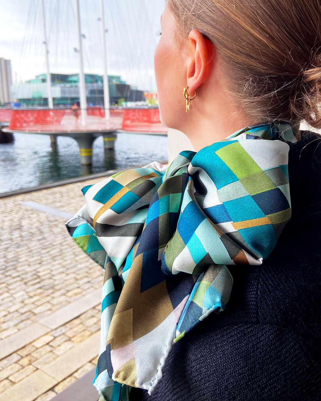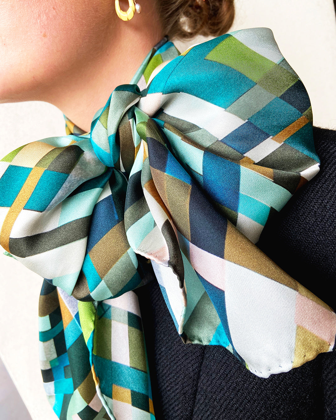 Silketørklæde med harlekintern i særlige smukke farver. Designet til dette skønne silketørklæde kommer fra et artwork i lyse turkisgrønne, varme olivenbrune og lyserøde papirstrimler der er flettet til Harlequin mønster. Det særlige for den lækre twill silke som tørklædet er lavet af er, at farverne bliver særlig smukke og glansfyldte. Silketørklædet vil gløde i mange farver og er derfor meget anvendeligt og det er nemt for dig, at at finde tøj der passer til.